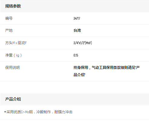 首頁>產(chǎn)品中心>扳手、手用套筒>套筒配件>世達(dá)1/2"系列風(fēng)動(dòng)轉(zhuǎn)接頭(1/2"方孔x3/4"方頭)